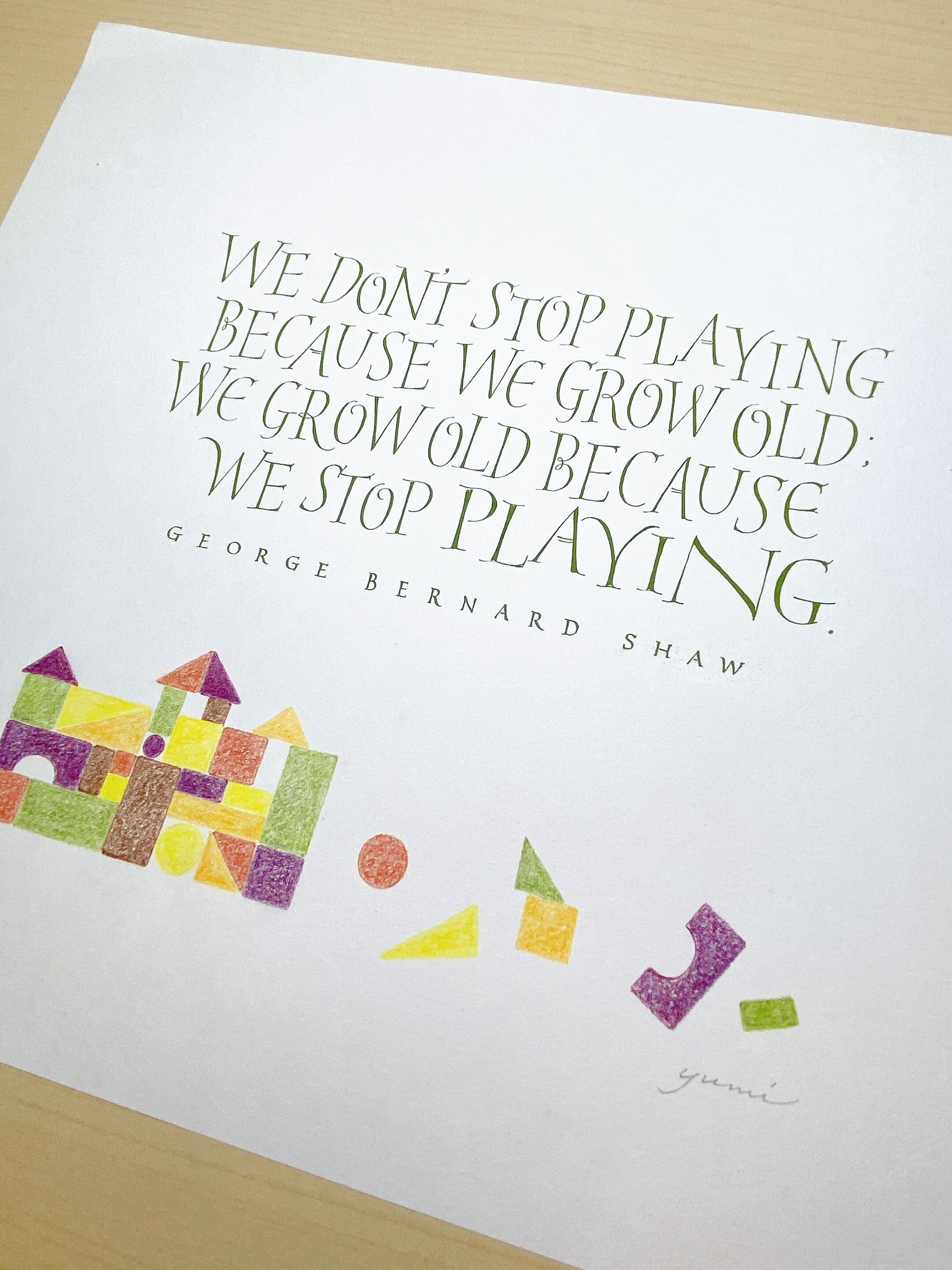 心にグサッとくる言葉を、かつて遊んでいた積み木の絵と共に作品にしました。